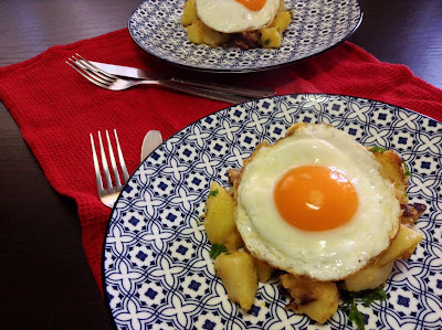 A receita que vos trago hoje, faz parte do pequeno almoço nos EUA. Eu sinceramente acho que seria impossível comer tal coisa ao pequeno almoço, mesmo num brunch acho difícil. A minha primeira refeição do dia pode ser bastante completa (pão, compota, leite, café, iogurte, muesli, sumo, frutas, etc) mas não consigo comer ovos e batatas logo de manha. Mas lembrei-me que esta seria uma óptima sugestão para um almoço rápido e foi exactamente isso que fiz. Foi uma refeição bastante apreciada mas continuo com a ideia que não o conseguia comer ao pequeno almoço.