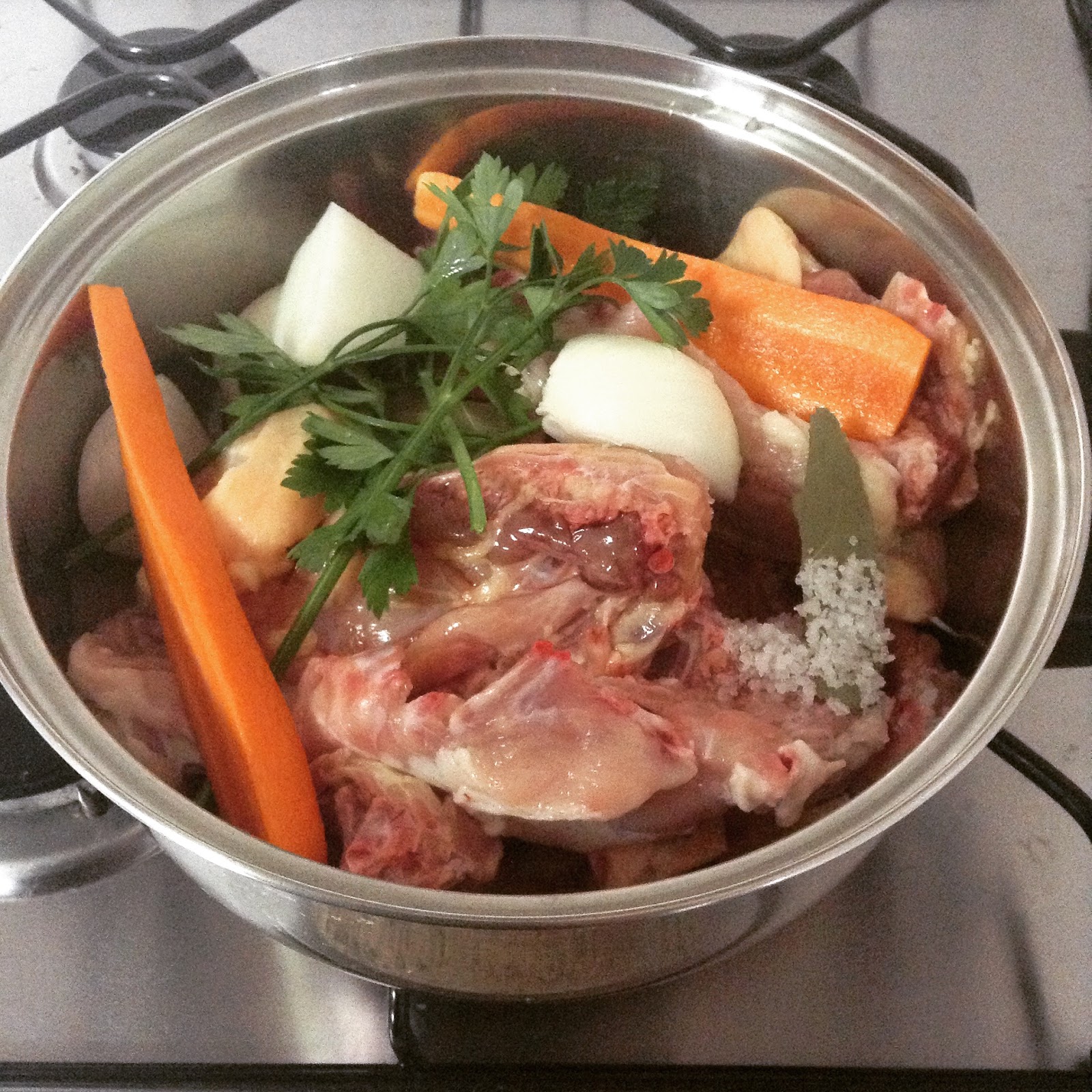 Na segunda feira, coloquei todas as carcaças de frango num tacho, adicionei uma cenoura descascada e cortada em quatro, uma cebola também cortada em quatro, dois dentes de alho, uma folha de louro, um ramo de salsa, sal e uma malagueta piripiri seca (podem temperar apenas com pimenta, como preferirem). Reguei tudo com água a ferver, até cobrir completamente e levei ao lume onde cozinhou por cerca de 1 hora.